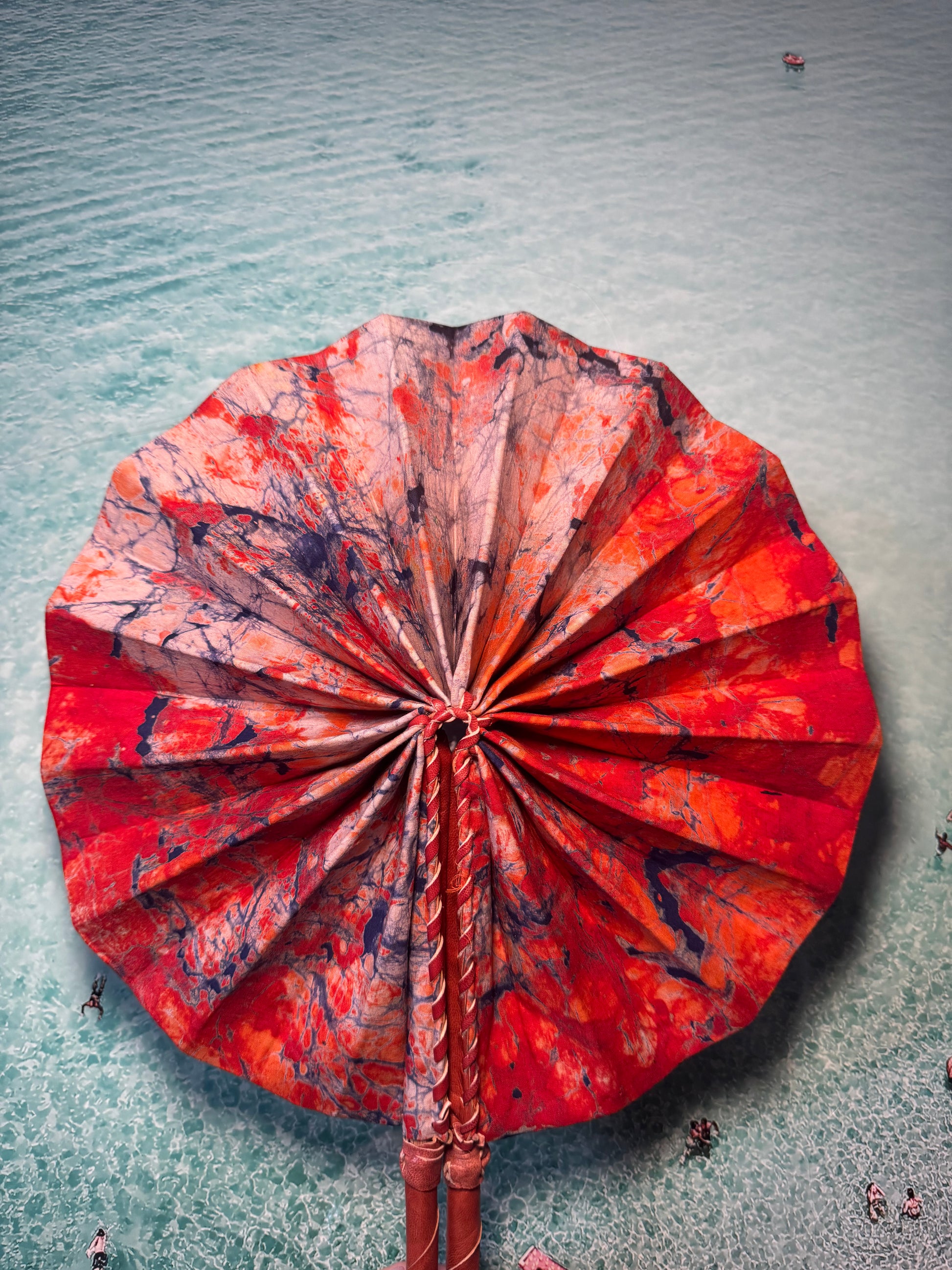 Feel the cool breeze with this one-of-a-kind handmade orange tie dye fan. Perfect for festivals, beach trips, or hot summer days. Keep it funky and functional with our unique design. Let the colours and patterns do the talking.