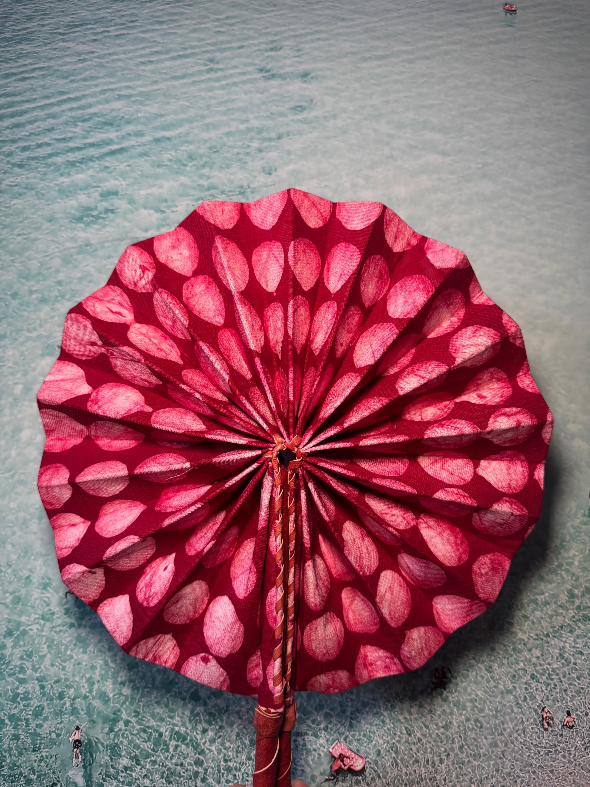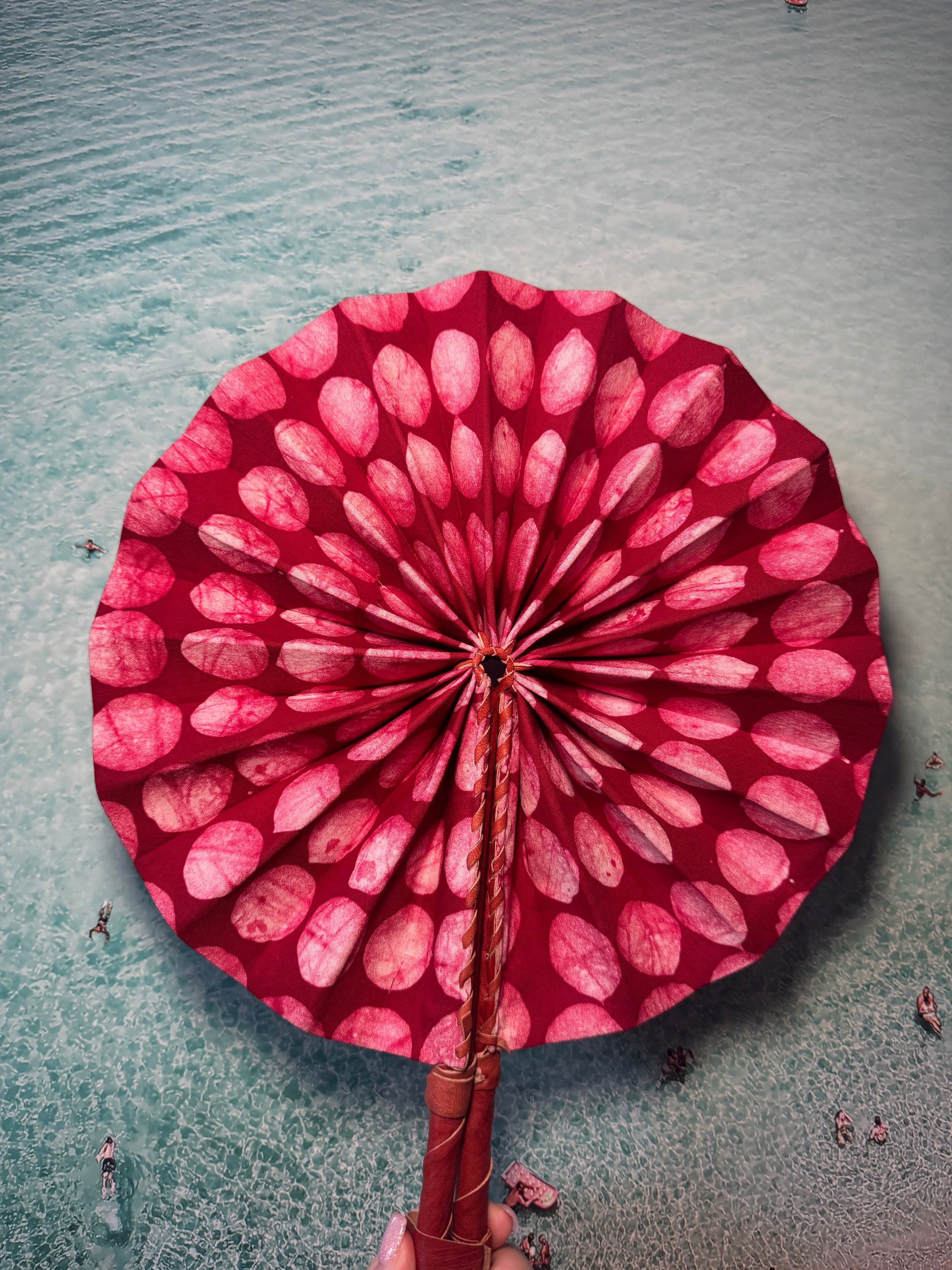 Feel the cool breeze with this one-of-a-kind handmade pink and red spotty fan. Perfect for festivals, beach trips, or hot summer days. Keep it funky and functional with our unique design. Let the colours and patterns do the talking.