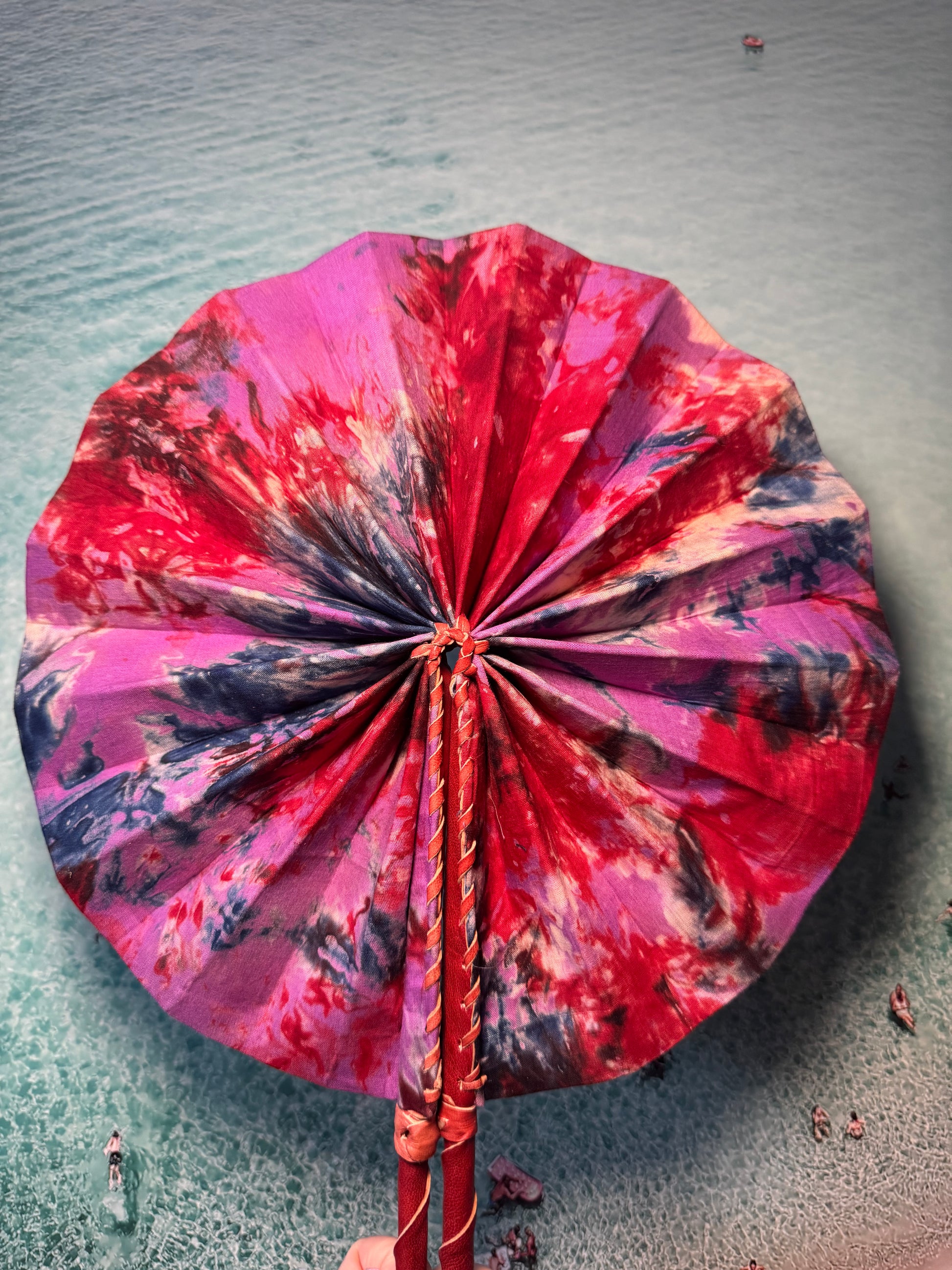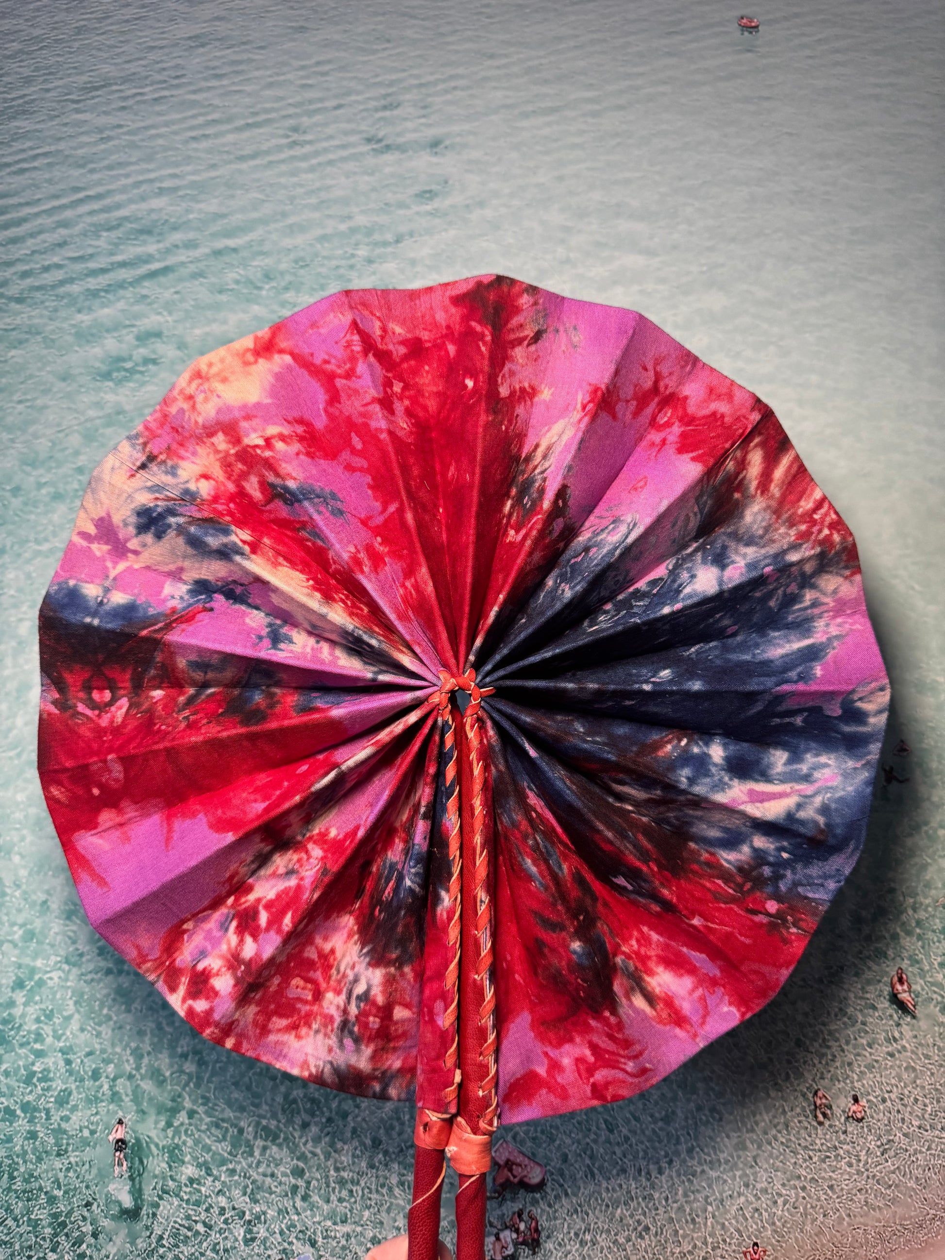 Feel the cool breeze with this one-of-a-kind handmade pink, red and blue tie dye fan. Perfect for festivals, beach trips, or hot summer days. Keep it funky and functional with our unique design. Let the colours and patterns do the talking.
