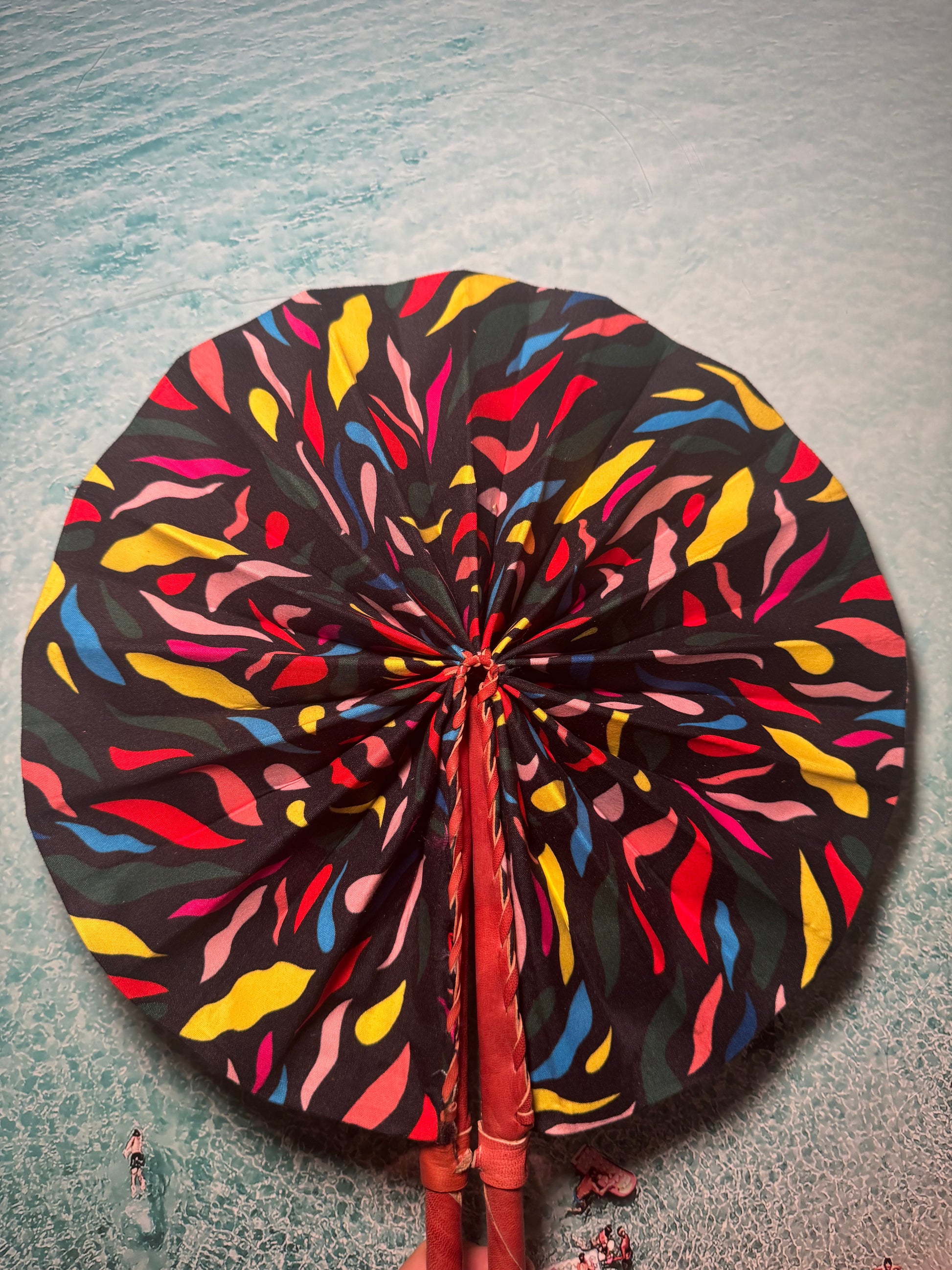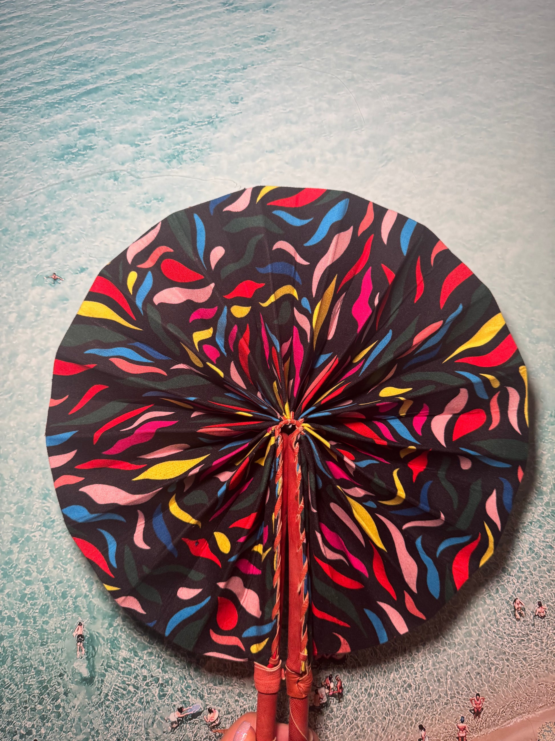 Feel the cool breeze with this one-of-a-kind handmade rainbow and black fan. Perfect for festivals, beach trips, or hot summer days. Keep it funky and functional with our unique design. Let the colours and patterns do the talking.